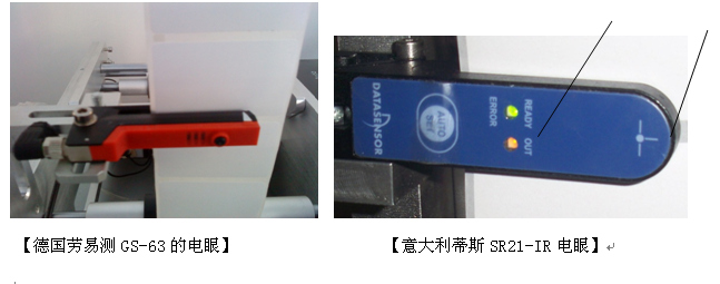 工作原理:屬于槽型電眼,通過穿透光量的強弱判別有無標簽,適用于底紙材質和標簽材質不同的標簽。